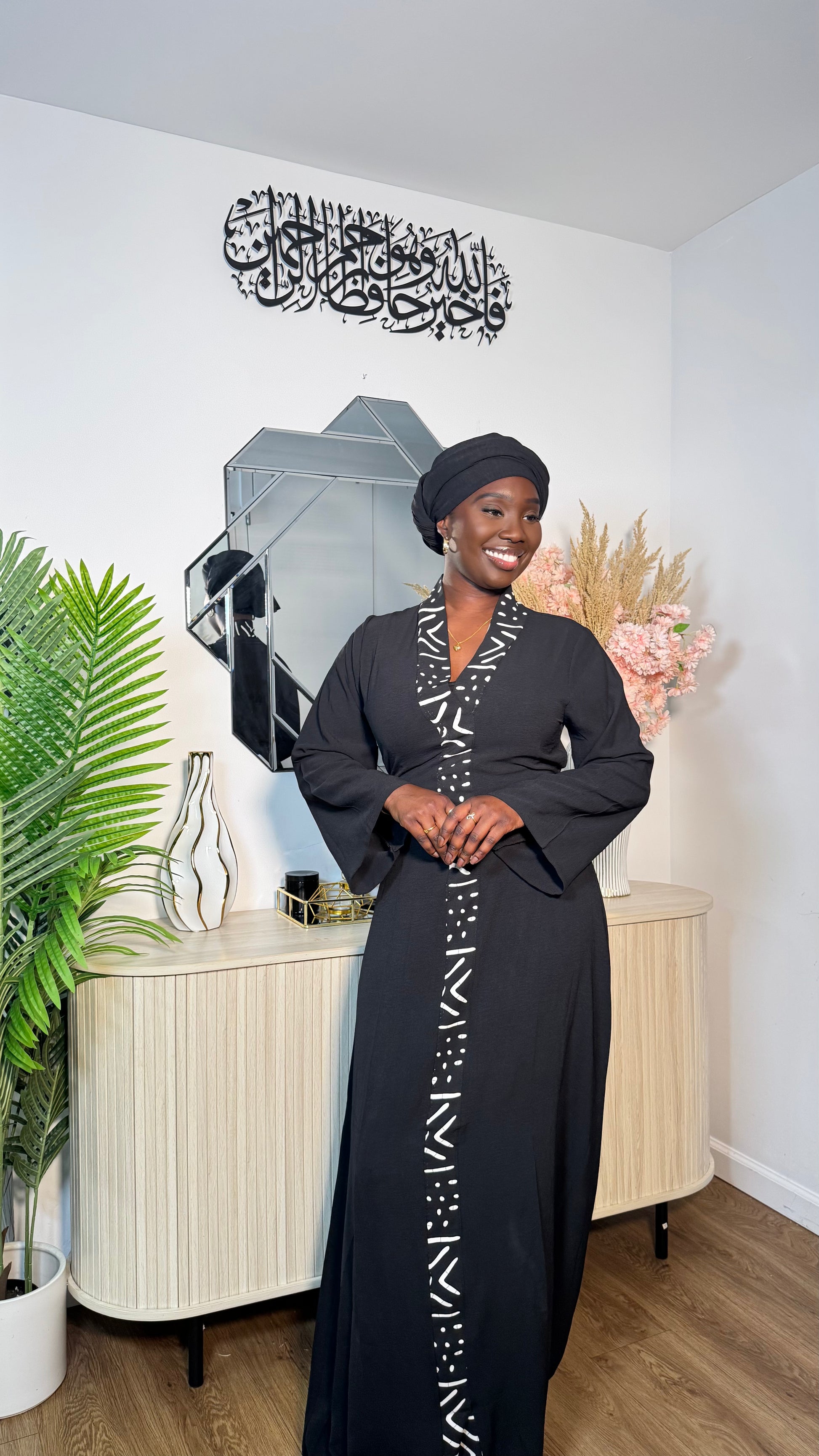 Our beautiful Robe Hawa embodies modern African elegance. This closed kaftan-style dress features a rich solid color with a front panel detailed in vibrant African patterns. The adjustable side ties allow you to wear it more fitted for a flattering silhouette. Paired with a large matching scarf, this piece is both timeless and effortlessly graceful.