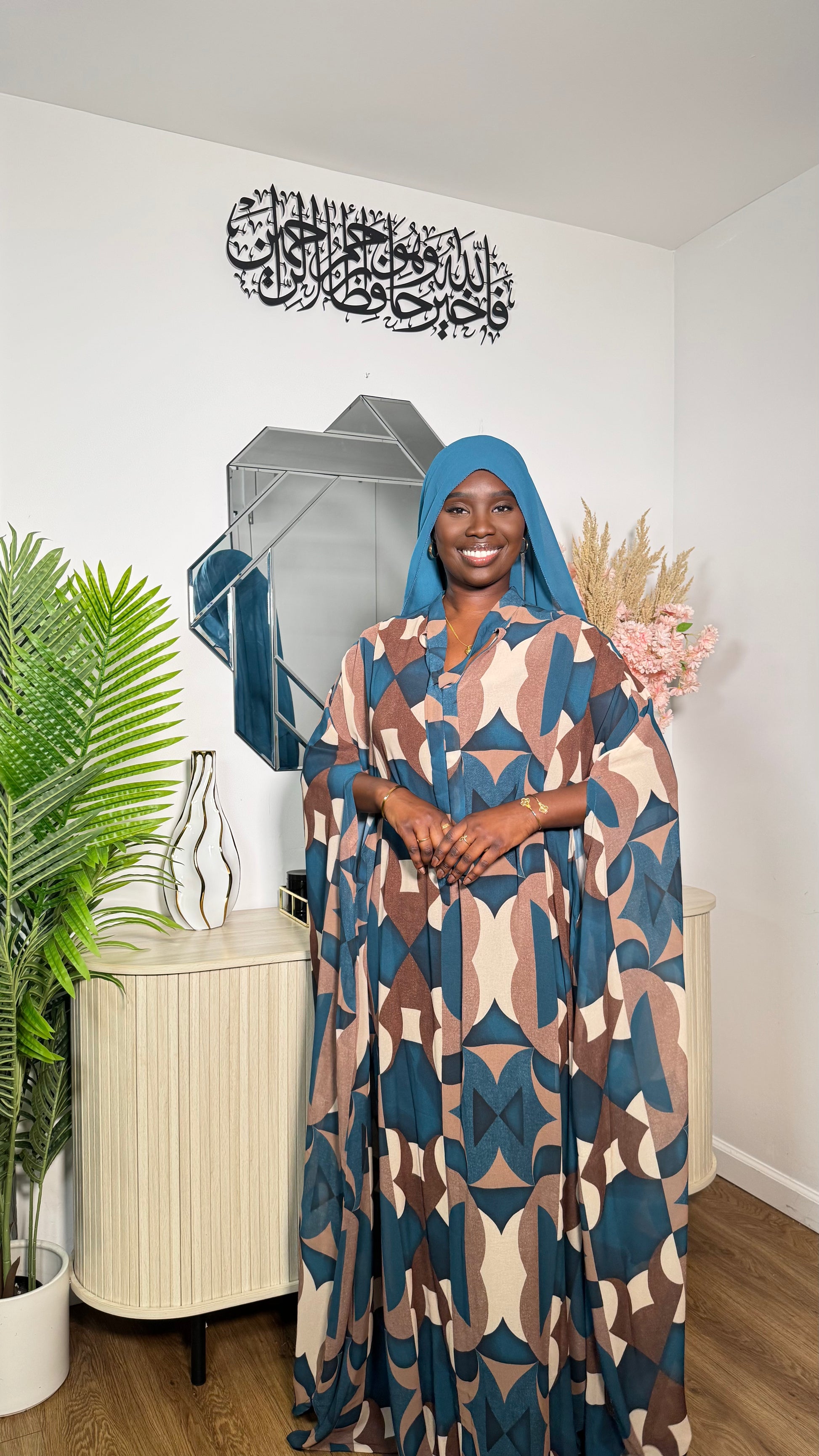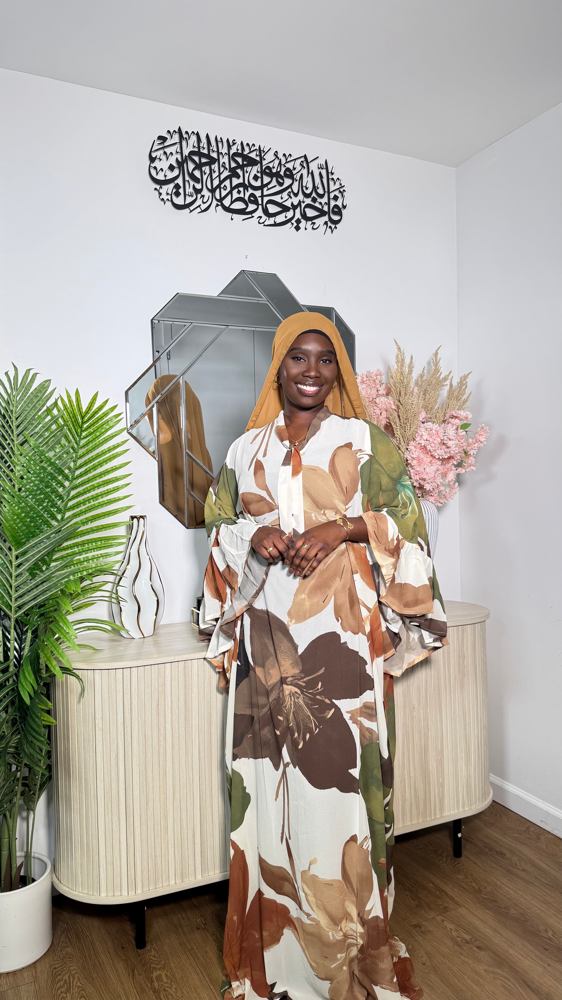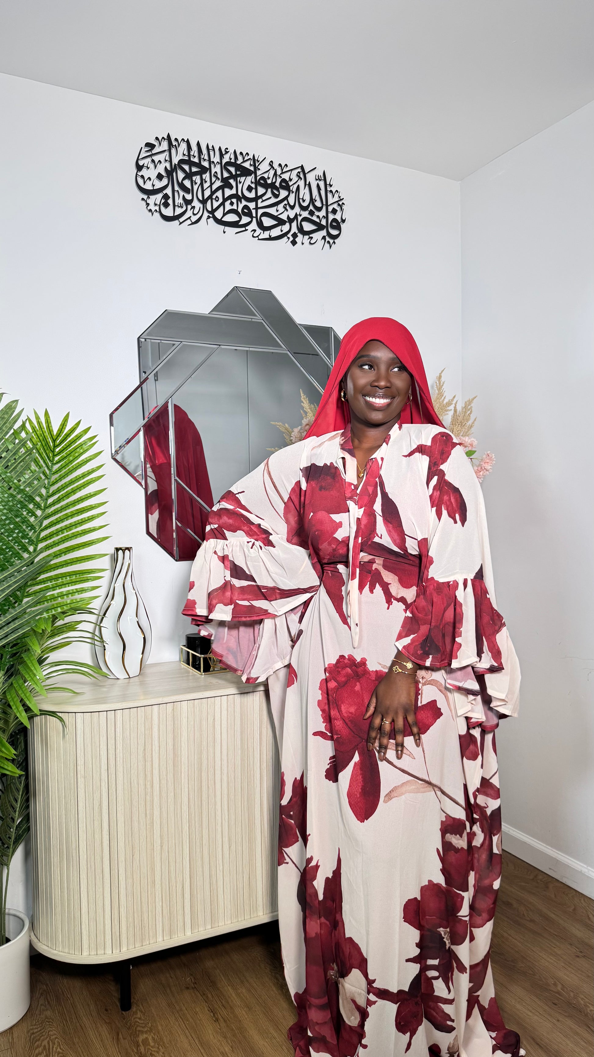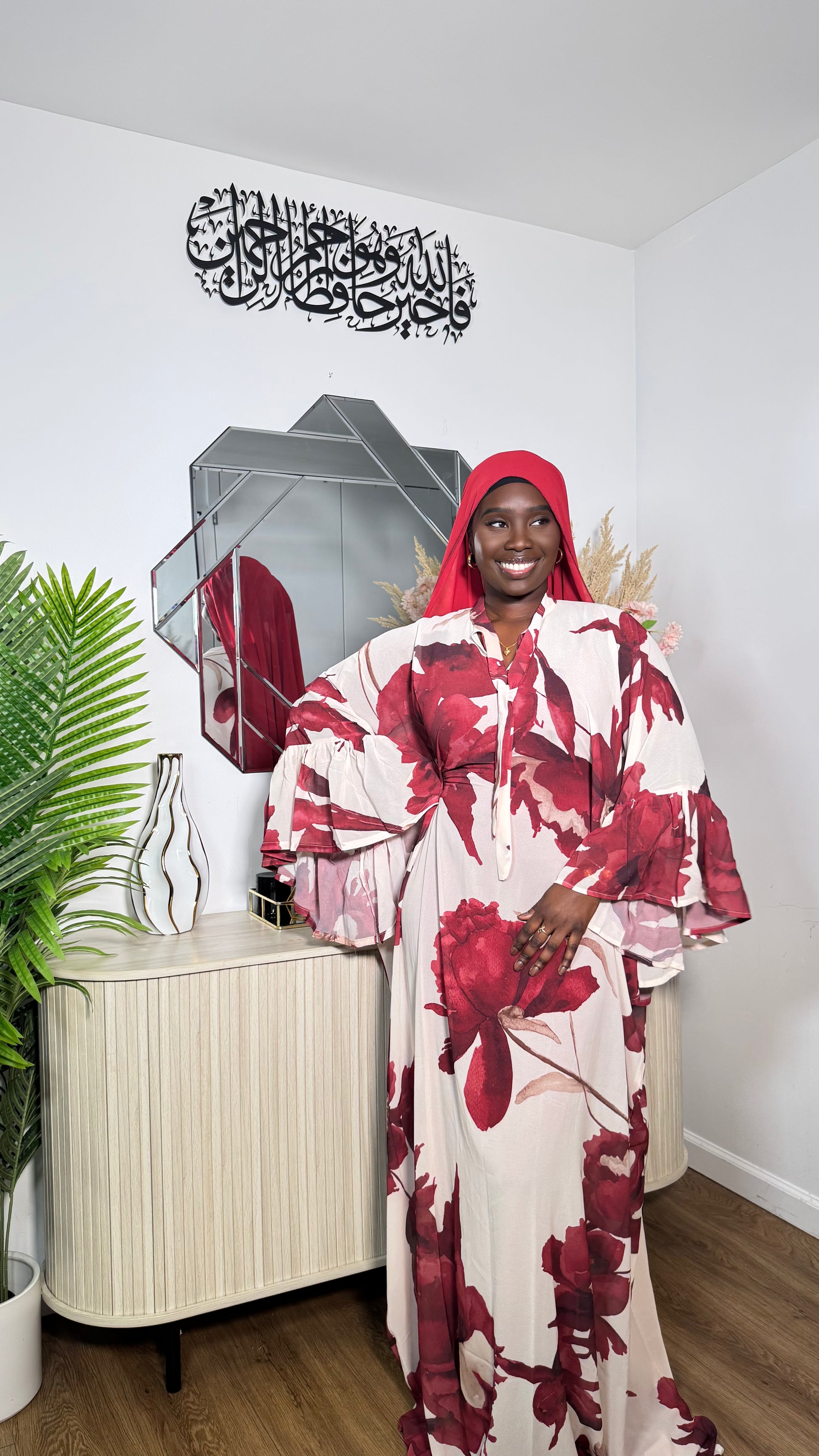 Our 3-piece Floral Print Robe Sokhna is a beautiful, classy set designed for effortless elegance. It includes a sleeveless underdress, a flowy top robe, and a matching chiffon scarf. You can wear it loosely for a relaxed look or adjust the inner tie for a more fitted silhouette. Featuring stunning ruffle sleeves and a large coordinating scarf, this set is perfect for any special occasion. Best suited for someone 5’8” and shorter.